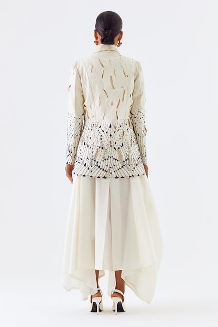 Ivory Chanderi Silk Cut Work, Embroidery Cutwork Jacket With Draped Kurta