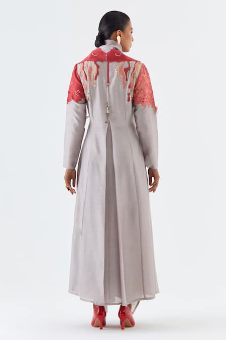 A light grey full-sleeved angrakha kurta crafted from silk chanderi and cotton linen fabric, featuring a draped collar and a red floral cutwork overlay. It is paired with coordinating light grey pants.