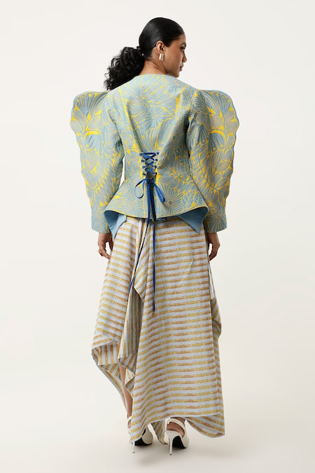 Light blue jacket featuring a notched lapel, leg-of-mutton sleeves, and floral cutwork details. Paired with an asymmetric hem skirt that includes a side slit and zipper detail.