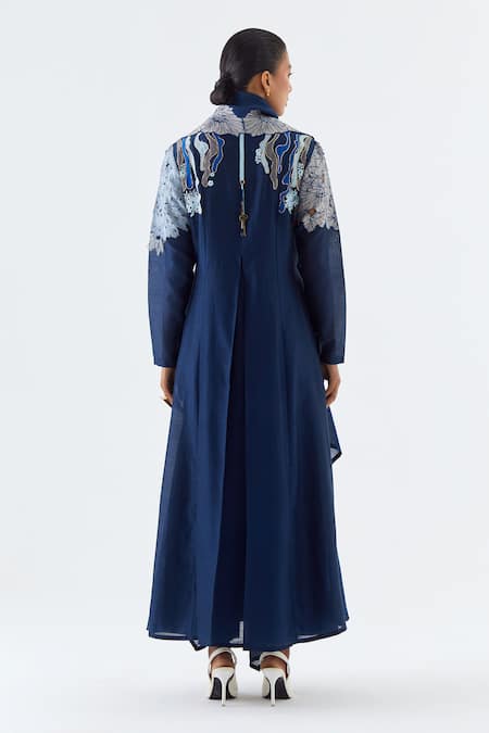A blue draped collar angrakha kurta crafted from silk chanderi and cotton linen fabric, featuring full sleeves and an asymmetric hem. It is paired with coordinating blue pants.