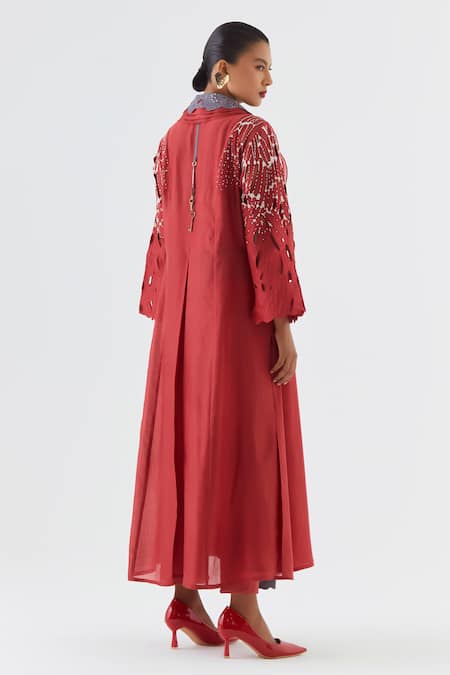 A red layered angrakha kurta crafted from silk chanderi and silk organza, featuring an overlap collar and cutwork details on the sleeves and side panel. It is paired with coordinating pants.