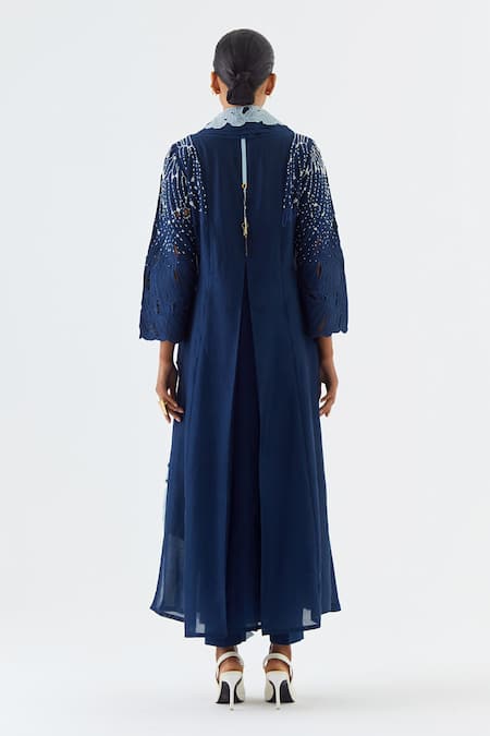 Indigo silk chanderi angrakha kurta featuring a layered collar, overlap design, and cutwork details on the sleeves and hem. Paired with coordinating indigo silk organza pants.