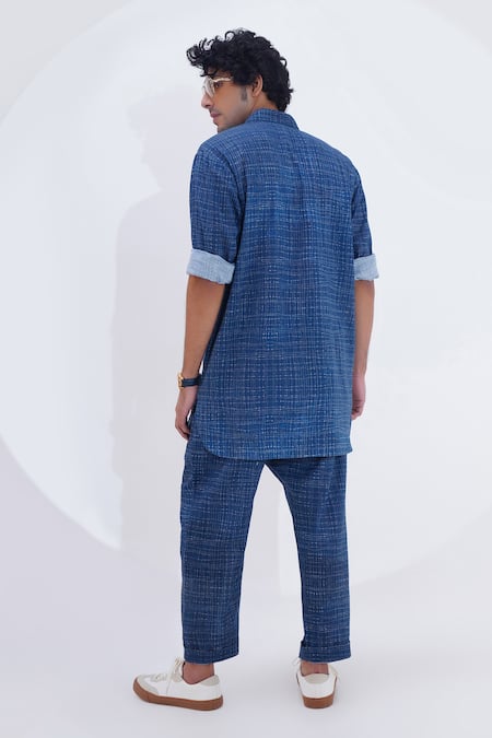 Blue linen kurta featuring all-over printed checkered motifs, front patch pockets, and a shirt collar. Paired with matching pants for a complete look.