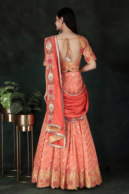 Orange Silk, Chanderi Embroidery V-neck Lehenga Saree With Blouse