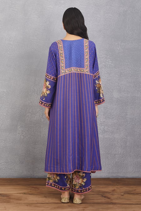 Amethyst purple long kurta with multi-color floral motif print & chevron pattern striped detail. Comes with pants & tassel dupatta.