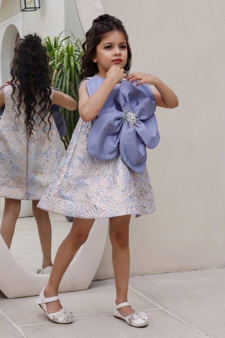 Blue dress featuring woven floral motifs and a large floral applique adorned with pearls at the center