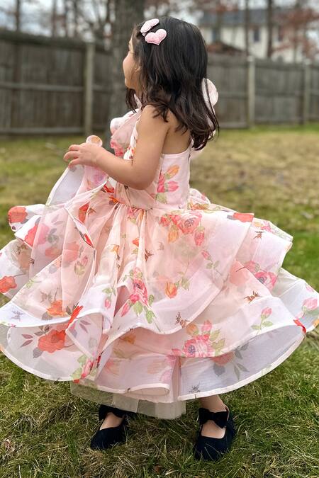 Peach tiered ruffled dress featuring an all-over floral print and one-shoulder design with frills