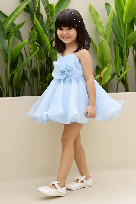 Blue Silk, Organza Fabric Elsa Rose Applique Embellished Dress And Overskirt Set