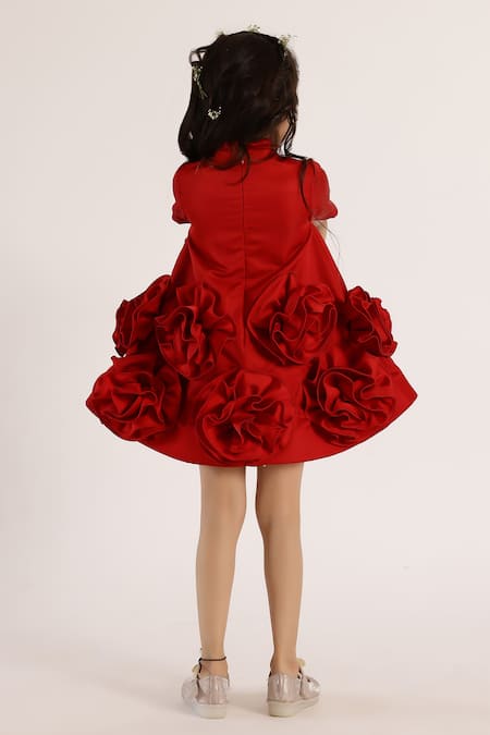 Red flared dress featuring pleated floral applique motifs at the hemline. Includes a detachable ruffle neck collar for added flair.