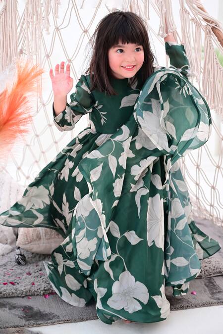 Bottle green anarkali featuring a round neckline and full sleeves with a contrast floral print. Paired with a printed ruffle dupatta for an elegant look.