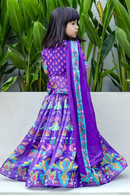 Purple lehenga featuring multicolor floral kalki print. Paired with a printed top and contrast border dupatta.