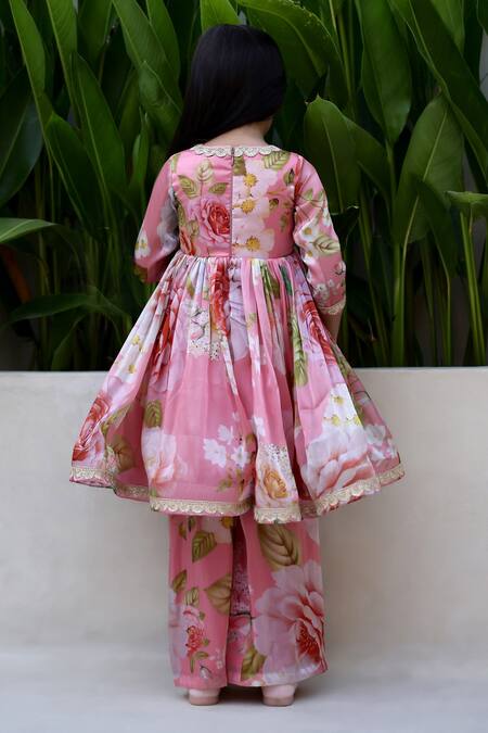 Pink and peach kurta featuring floral prints and lace detailing. Paired with matching sharara pants.
