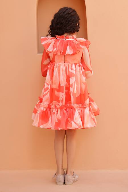 Orange Organza, Satin Ruffles Floral Print Dress