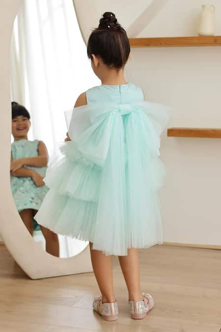 Green Net, Silk, Shantoon Sequins, Bows Ocean Glow Layered Back Party Dress