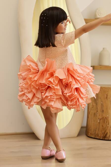 Peach dress featuring woven abstract motifs and pleated frill tiered detail