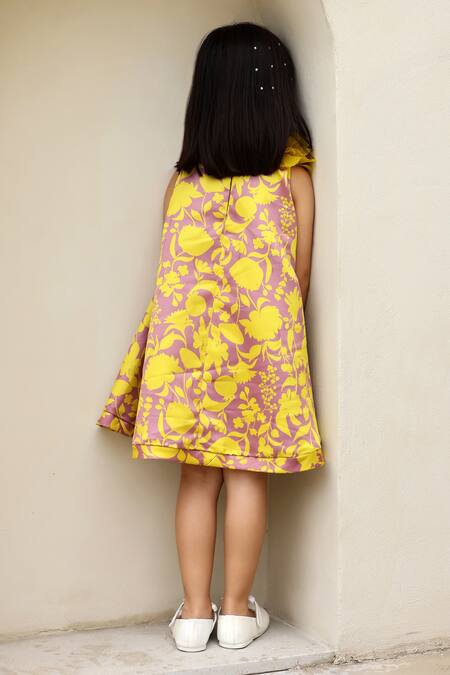 Yellow floral printed A-line baggy dress featuring 3D flower embellishments