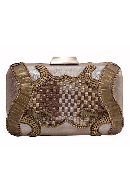 Gold clutch featuring metallic leather basket woven motifs and metal bead embellishments