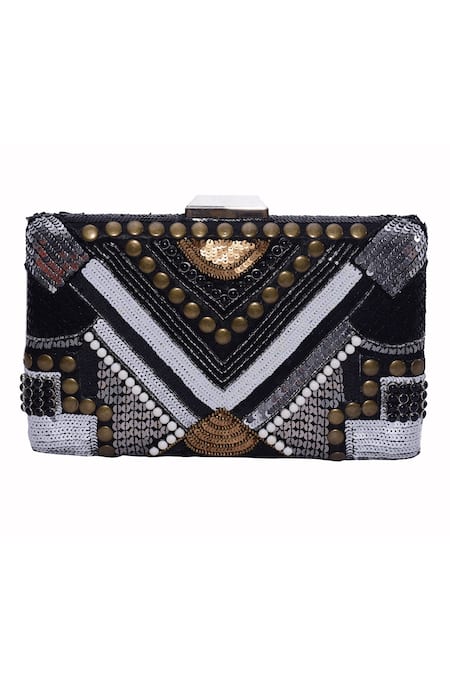 Black rectangle shaped box clutch featuring sequin, cutdana, bead, and metallic stud embellishments