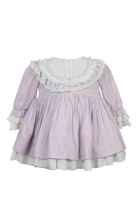 Lilac cotton dress featuring a round neckline with lace detailing and full cuffed layered sleeves