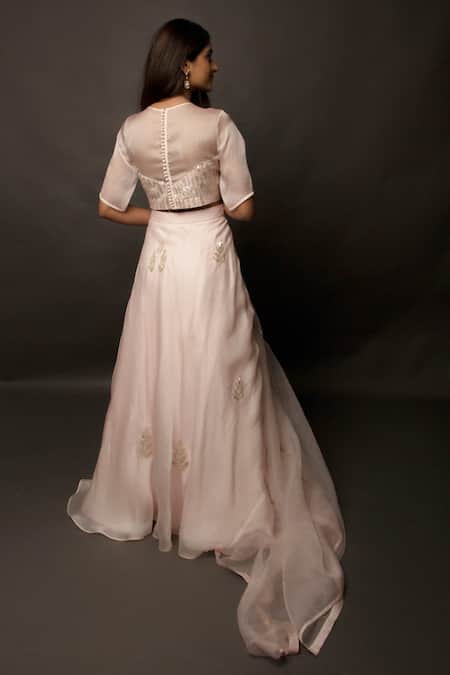 Pale pink skirt style lehenga satin organza lehenga skirt is embroidered with zari and sequins leaf motifs. Paired with top, embellished with linear sequins and coordinating silk organza dupatta, embroidered with sequin motifs finished with a raw silk border.