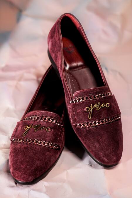 Wine loafers with chain embellished & stack heels.
