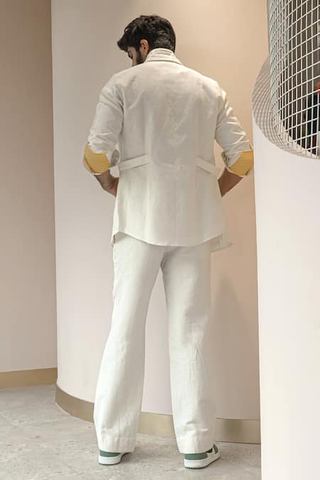 White cotton linen overshirt with yellow panels & double lapel collar. Paired with shirt & trouser.
