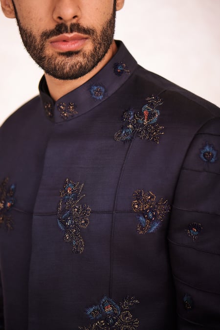 Midnight blue bandhgala with floral motif hand embroidery with pintuck details. Paired with midnight blue kurta and tapered trouser pant.