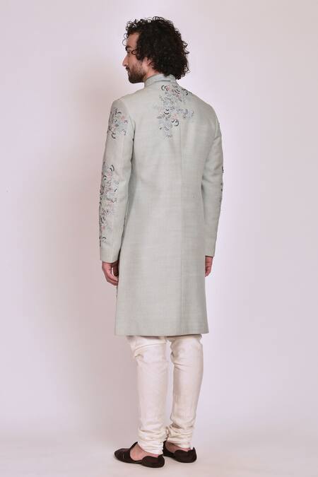 Ice blue sherwani with floral embroidered motifs, highlighted in 3D brass elements & dabka work. Paired with churidar & a kurta.
