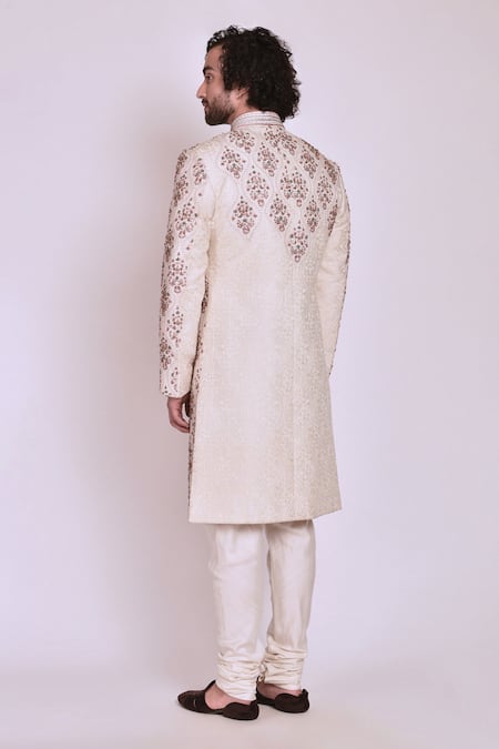 Ivory sherwani with floral embroidered motifs & textured detail. Paired with churidar & a kurta.
