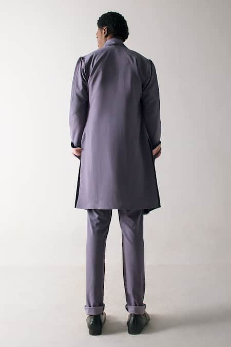 Purple coat featuring French knot embroidery, pintucked sleeves, and golden buttons