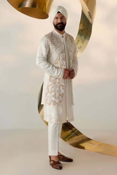 Ivory kurta set featuring a band collar and long sleeves, complemented by a hand-embroidered shrug. Paired with tapered trousers in a matching ivory shade.