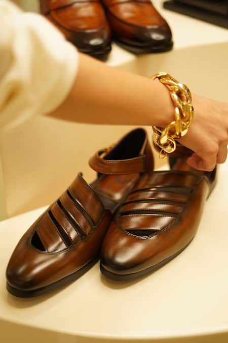 Brown handmade shoes with U-buckle & hand brush stroke finishing.
