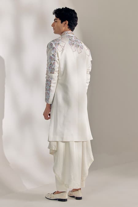 Ivory front open sherwani with geometrical embroidered details. Paired with an ivory trail kurta and churidar.