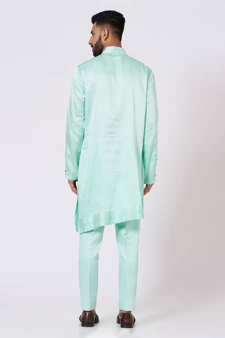 Tiffany blue asymmetric kurta with pintucks, band collar, button placket at the shoulder & full sleeves. Comes with tapered-fit trousers.