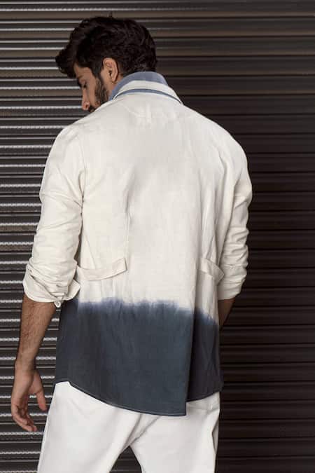 Ombre white overshirt with double lapel collar and patch pocket details. Paired with shirt & tapered trouser.