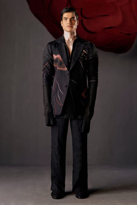 Black full sleeves overshirt featuring sequin eyes embellished motifs and sprinkle embellishments. Paired with an abstract pattern embellished shirt and trouser.