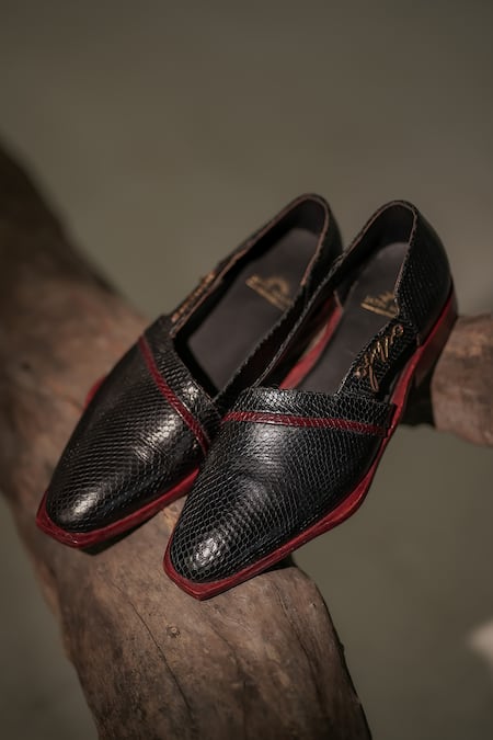 Black leather caligae featuring a snakeskin textured pattern and almond front