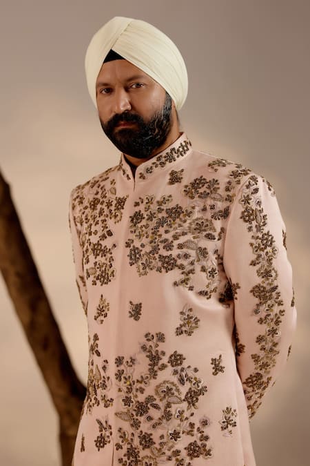 Blush pink sherwani featuring floral embroidery with dabka and moti work. Paired with a matching full sleeves kurta and churidar.