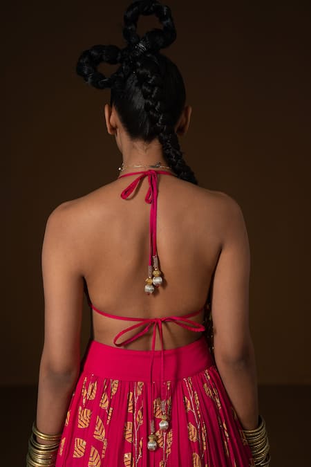 Fuchsia lehenga featuring leaf print with sequin and cutdana embroidery. Paired with a pleated padded bralette and pre-draped dupatta.