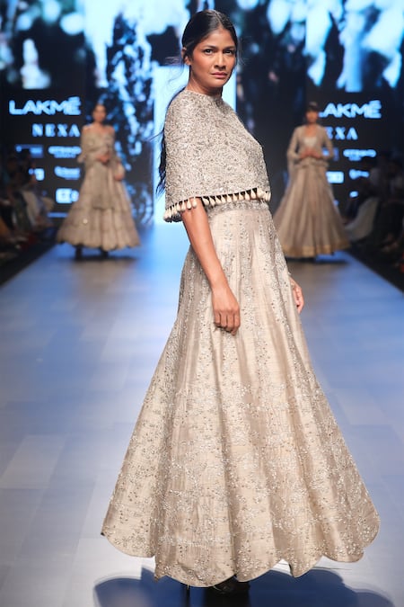 Buy_Jayanti Reddy_Beige Embroidered Cape With Lehenga _at_Aza_Fashions