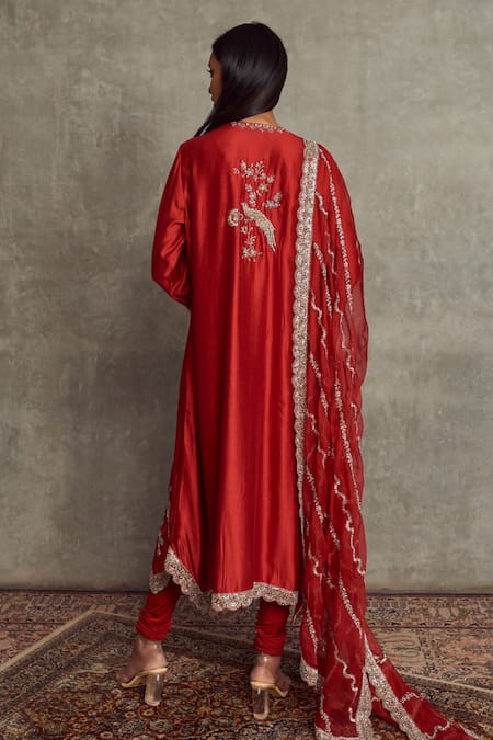 Red kurta with floral, bird embroidery & scallop border. Paired with churidar & embroidered scallop dupatta.