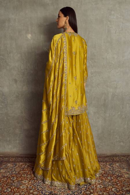 Yellow Cheniya Silk Floral Round Embroidered Kurta Sharara Set