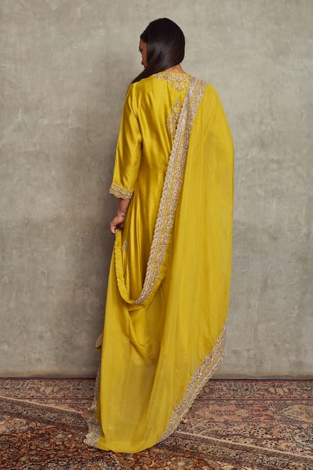 Yellow Cheniya Silk Floral Notched Embroidered Kurta Set
