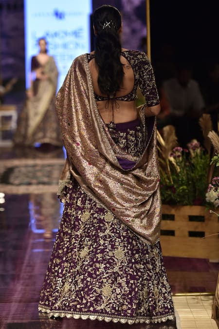 Purple silk lehenga with zari embroidered motifs & scalloped hem. Paired with embroidered blouse & gold dupatta.