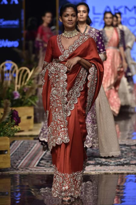 Red silk saree with zari embroidered motifs & scalloped hem. Paired with embroidered blouse.