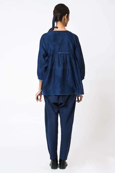 Indigo blue top made from Chanderi silk featuring three quarter sleeves and round neckline