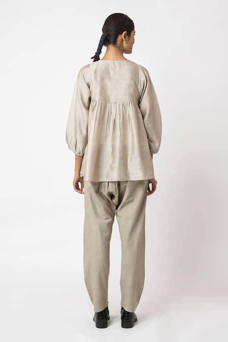 Beige pleated flare top made from Chanderi silk featuring placement golden thread embroidery