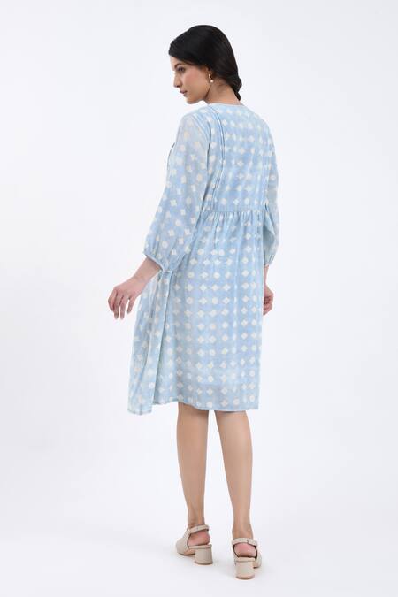 Buy_JAYATI GOENKA_Blue Cotton V-neck Block Print Gathered Yoke Dress _Online_at_Aza_Fashions