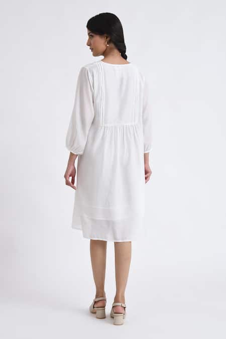 White cotton gathered dress featuring a notched neckline, balloon sleeves, and a flared hem