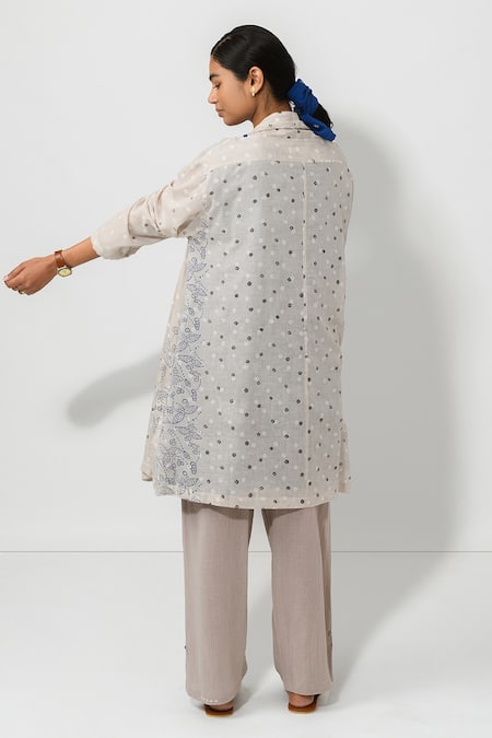 Grey open front jacket with geometric prints and blue floral prints. Comes with indigo embroidered kurta and grey straight pants.